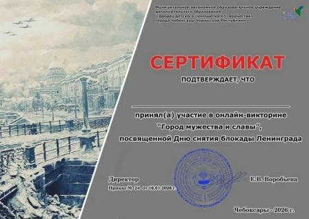 Обучающаяся 3 «В» класса (классный руководитель Л.А.Парамонова) Леонтьева Аксинья приняла участие в городской онлайн-викторине «Город мужества и славы», посвящённой Дню снятия блокады Ленинграда. Викторина была направлена на расширение знаний школьников о героическом подвиге жителей Ленинграда в годы Великой Отечественной войны и сохранении памяти о той трагической, но славной странице истории. Такие мероприятия способствуют развитию патриотизма и уважения к истории своей страны.