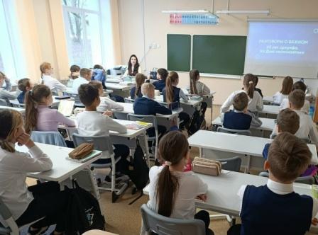 Ведущей встречи выступила актриса Русского драматического театра Татьяна Петровна Володина. Вместе со школьниками она погрузилась в повесть А.С. Пушкина «Барышня-крестьянка».