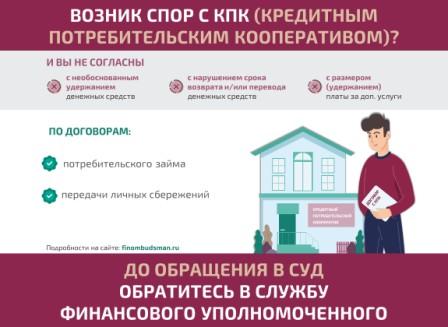 Для решения спора с КПК без суда обратитесь к финансовому уполномоченному. Он бесплатно рассматривает в досудебном порядке обращения клиентов КПК – физических лиц, содержащие денежные требования в размере не более 500 тысяч рублей.